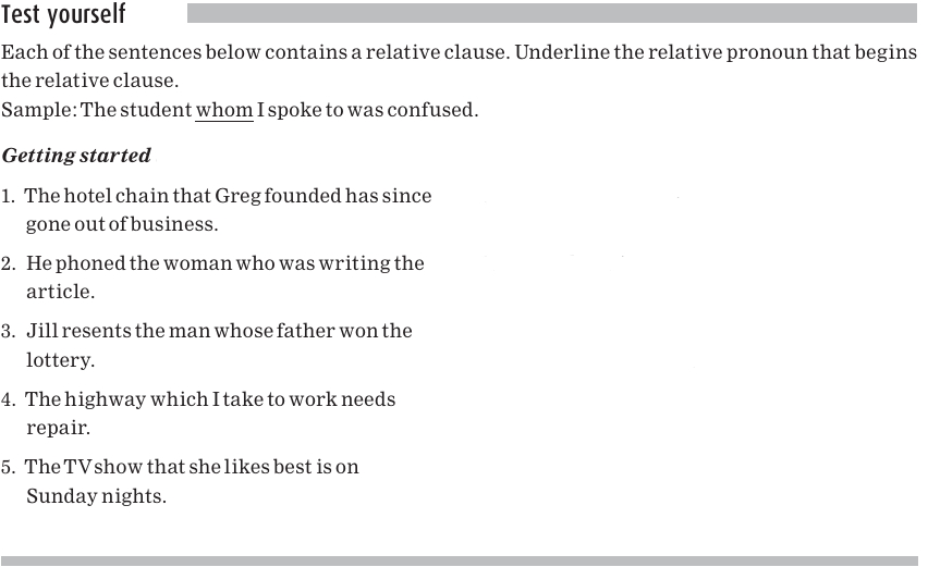 Relative clauses begin with one of the relative pronouns: that, which, who, whom, whose.