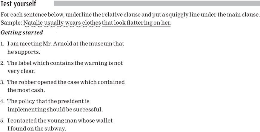 In each sentence below, the relative clause is underlined, and the noun phrase which the relative clause is modifying is in bold. The main clause can stand on its own as a sentence without the relative clause; the relative clause just provides additional information about the noun phrase it’s modifying and cannot stand alone. Like other clauses, a relative clause has its own subject and verb phrase.