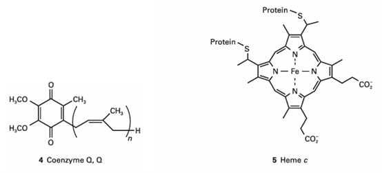 Reduced Q migrates to complex III (Q-cytochrome c oxidoreductase), which catalyses the reduction of the protein cytochrome c (Cyt c). Cytochrome c contains the haemcgroup (5), the central iron ion of which can exist in oxidation states +3 and +2. The net reaction catalysed by complex III is