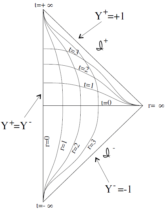 There are several infinities on the Penrose diagram. Future and past time-like infinities (t = ±∞) are the beginnings and ends of time-like trajectories. Space-like infinity (r = ∞) is where all space-like surfaces end. In addition to these there are two other infinities which are called I±.
