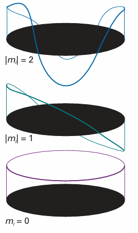 Fig. 9.31 The real parts of the wavefunctions of a particle on a ring. As shorter wavelengths are achieved, the magnitude of the angular momentum around the z-axis grows in steps of $.