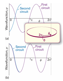 Fig. 9.28 Two solutions of the Schrödinger equation for a particle on a ring. The circumference has been opened out into a straight line; the points at φ = 0 and 2π are identical. The solution in (a) is unacceptable because it is not single valued. Moreover, on successive circuits it interferes destructively with itself, and does not survive. The solution in (b) is acceptable: it is single-valued, and on successive circuits it reproduces itself.