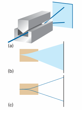 Fig. 9.39 (a) The experimental arrangement for the Stern–Gerlach experiment: the magnet provides an inhomogeneous field. (b) The classically expected result. (c) The observed outcome using silver atoms.