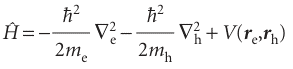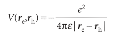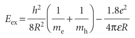 where |re − rh| is the distance between the electron and hole and ε is the permittivity of the medium (we are ignoring the effect of polarization of the medium due to the presence of charges). Solving the Schrödinger equation in this case is not a trivial task, but the final expression for the energy of the exciton, Eex, is relatively simple (see Further reading for details):