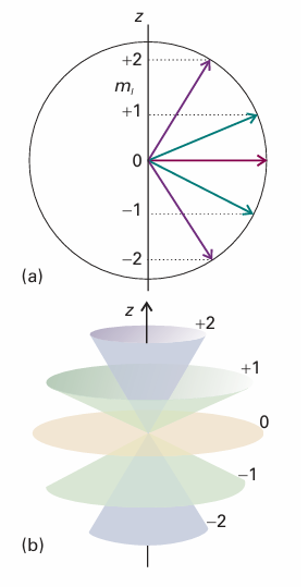 Fig. 9.40 (a) A summary of Fig. 9.38. However, because the azimuthal angle of the vector around the z-axis is indeterminate, a better representation is as in (b), where each vector lies at an unspecified azimuthal angle on its cone.