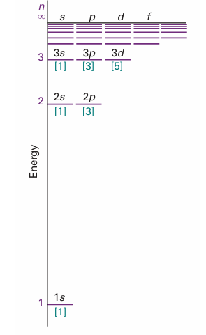 Fig. 10.7 The energy levels of the hydrogen atom showing the subshells and (in square brackets) the numbers of orbitals in each subshell. In hydrogenic atoms, all orbitals of a given shell have the same energy.