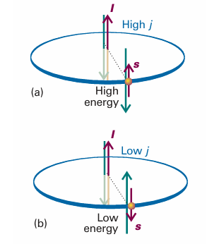 The unpaired electron in the ground state of an alkali metal atom has l = 0, so j = 1–2. Because the orbital angular momentum is zero in this state, the spin–orbit coup ling energy is zero (as is confirmed by setting j = s and l = 0 in eqn 10.41). When the electron is excited to an orbital with l = 1, it has orbital angular momentum and can give rise to a magnetic field that interacts with its spin. In this configuration the electron can have j = 3/2 or j = 1/2, and the energies of these levels are