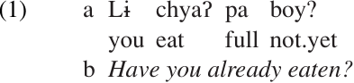 Of course, in many contexts there is a close relationship between meaning and function. For example, if a doctor wants to administer a certain medicine which cannot be taken on an empty stomach, he will probably ask the patient: “Have you eaten?” In this situation both the meaning and the function of the question will be essentially the same whether the doctor is speaking English or Teochew. The FORM, however, would be quite different. Compare the Teochew form in (1a) with its English translation in (1b):