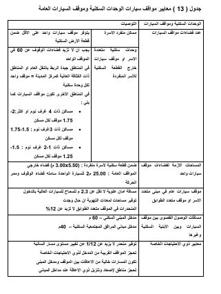 ب ـ توفير مواقف السيارات بالنسبة للإسكان متعدد الاسر ضمن المبنى السكني او في ساحات مخصصة كمواقف سيارات او على امتداد الشارع المجاور ويجب ان تربط مع الشوارع الربط الثانوي. ح ـ يجب الاهتمام بتصميم مواقف السيارات كجزء من النظام العام للمناطق المفتوحة لكي لا تؤثر سلبا على استخدام وعلى مظهر المنطقة المفتوحة.