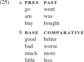 Another common pattern in synthetic (or fusional) languages is that a certain category may be expressed by SUPPLETION, i.e. a change in the form of the root, rather than by adding an affix.4 This pattern is found in the past tense forms of some English verbs (25a), and in the comparative forms of some English adjectives (25b).In a sense, the suppletive form (e.g. went) is a portmanteau morpheme expressing both the basic meaning of the root (‘go’) and one or more additional grammatical categories (‘past tense’).