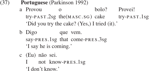 Subject pronouns are generally optional in Portuguese, as indicated in (37c); such pronouns could be added to examples (37a,b) as well. But subject pronouns are, in a sense, redundant, because the person and number of the subject are already indicated by the form of the verb. Since the pronoun adds no new information, it is not surprising that it can be easily omitted. (Third person pronouns, which add information about masculine vs. feminine gender, are less likely to be omitted than first and second person pronouns.) However, pronouns can sometimes be omitted even when there is no verbal morphology to preserve the information. Portuguese verbs do not agree with their objects, but object pronouns can be dropped when the referent can be identified from the immediate context, as in (37a).