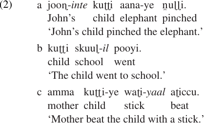 1. Some morphophonemic alternations are omitted from the table in (3). Mohanan (1982) refers to a second dative case category, “dative 2,” which is also omitted here.