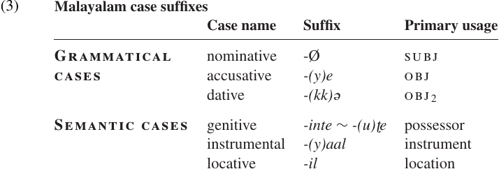 Grammatical cases are normally used only for TERM relations (SUBJ, OBJ, OBJ2). A case form that is used to mark direct objects (like Malay alam–ye in examples (1c), (1g), and (1h)) is traditionally referred to as the ACCUSATIVE case. A case form like Malayalam-kkə(examples(1f), (1g), (1h)) that is used for “indirect objects,” i.e. recipient secondary objects, is traditionally referred to as the DATIVE case. A case form that is used for subjects is normally called the NOMINATIVE case; thus we could say that the nominative case is unmarked in Malayalam, because no suffix is added to the subject.