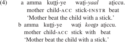 In addition to the use of semantic case, another common way of marking oblique arguments and adjuncts is through the use of prepositions or (as in Malayalam) POST-POSITIONS. Sometimes there are two different ways to indicate the same semantic role. For example, the instrument role is marked by semantic case in (4a), but by a post-position in (4b). The two sentences have the same meaning, but (4a) would be used primarily in formal speech, while (4b) would be preferred in informal speech (K. P. Mohanan, p. c.).
