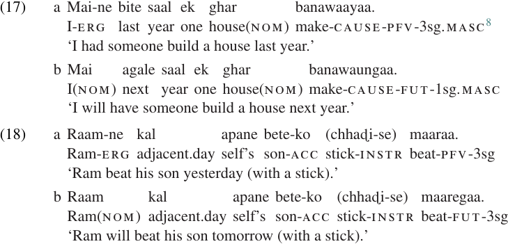 8. Note that the verb in this example agrees with the nominative object, rather than the ergative subject. (I have been unable to locate the original source for examples 17–18.)
