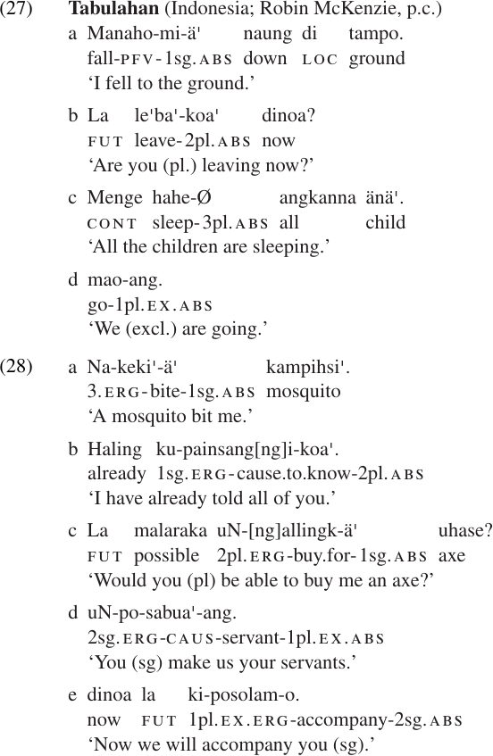 Of course, the terms “absolutive” and “ergative” are also used for case markers. However, in referring to absolutive agreement and ergative agreement, we are not saying that verbs in Tabulahan are marked for case. It is important to remember that case is, by definition, marked on NPs; verbs cannot take case marking unless they have been “nominalized”.