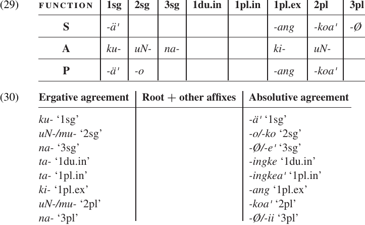 In order to see the patterns in a complex paradigm of this kind, it is often helpful to lay out the forms in some kind of work-chart. The chart in (29) lists the agreement affixes which occur in examples (27–28) according to their functions: S (intransitive subject), A (transitive subject), and P (transitive object). There are gaps in the chart, due to the limited amount of data in these examples, but we can see that wherever we have all three forms for a given person and number, the S and P forms are the same while the A form is different. For this reason, we refer to the two sets of affixes as ergative vs. absolutive agreement, rather than subject vs. object agreement. The complete set of Tabulahan agreement affixes is displayed in the partial position class chart in (30).1