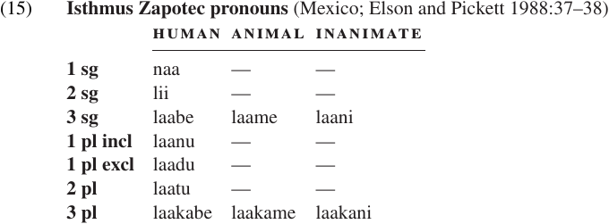 1. Foley (1986:70–71) mentions several Papuan languages from the island of New Guinea which do not have distinct singular vs. plural pronoun forms. Asheninca Campa (Peru) may be another counter-example to Greenberg’s generalization. Reed and Payne (1986) report that Asheninca pronouns can optionally be pluralized using the same plural suffix used for nouns, but in fact this is rarely done where the number can be inferred from the context.