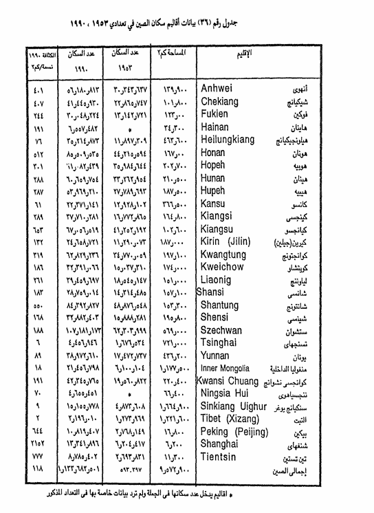 يوضح الجدول رقم (36) أن توزيع السكان فى الصين يختلف في تعداد 1990 عما كان عليه في تعداد 1953 ، وذلك بتأثير تباين معدلات النمو السكاني ودرجة الجذب أو الطرد من إقليم لآخر ، ومع ذلك فإن ثمة تباينا واضحا في توزيع السكان وكثافتهم بين الأقاليم الواقعة في شرق الصين وتلك الواقعة في غربة ، أو بين مناطق التركز السكاني والكثافات المرتفعة في مناطق السهول النهرية ذات التربة الخصبة وخاصة في المجارى الدنيا ، ومناطق دلتاوات الأنهار العظمى مثل اليانجتسي أو سهول حوض ساشوان ، حيث توجد أخصب أراضى الصين وأعلاها فى الكثافات الزراعية أما في الأقاليم الغربية من الصين ، حيث المناطق الصحراوية الجافة والمناطق الرملية فيوجد تخلخل في الكثافة وتناثر في توزيع السكان، ومن أمثلة هذه المناطق شبه الخالية من السكان حوض تاريم وحوض زونجاريا ، هذا إلي جانب هضبة التبت والمناطق الجبلية المرتفعة حيث سلاسل كون لن والتن طاغ والتاي وغيرها من السلاسل الجبلية التي تتفرع من جبال الهملايا في آسيا الوسطى.
