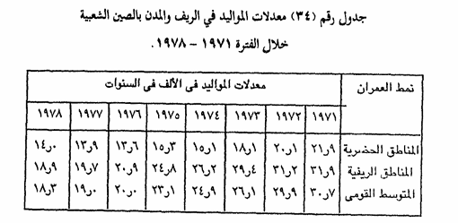 ويتضح من الجدول أن الاتجاه العام في كل من الحضر والريف هو انخفاض معدلات لمواليد، وبالتالي فإن المتوسط القومى فى الصين يتجه نحو الإنحفاض ، غير أنه يلاحظ أيضا أن المناطق الريفية أقل فى معدلاتها من المناطق الريفية ، ويظهر أثر غلبة الريف على نمط السكان في أن المتوسط القومي أكثر قربا من متوسط المعدلات في مناطق العمران الريفي ، فإذا أضفنا إلى ذلك أن الصين تحرص فى مناطق الأقليات العرقية على عدم تطبيق سياساتها الخاصة بتبني نمط الأسرة الصغيرة أو تطبيق أسلوب أسرة الطفل الواحد في مناطق الأقليات فإن هذا يعني أن ثمة تعددا في أنماط المواليد في أجزاء الصين المختلفة ولكم برغم ذلك ، فإن تفشي البطالة في الريف وفي مناطق الأقليات العرقية أيضا يؤدي في النهاية إلى أن تتقارب المناطق الريفية ومناطق الأقليات العرقية والتي تشمل ما بين 5 - 6 % من جملة سكان الصين مع المناطق الحضرية في الاتجاه إلى الأخذ بسياسة الدولة فى تبنى نمط الأسر الصغيرة ، ومن هنا نتوقع أن يكون الاتجاه نحو مزيد من انخفاض معدلات المواليد في الصين كما في شكل رقم ( 34 ) عن المعادلات الحيوية في الصين 1953 - 1990 ويظهر من متابعة المعدلات الحيوية فى الصين خلال الخمسين عاما الماضية أثر الأحداث الداخلية على المعدلات ، ويرتبط ذلك بكل من تطبيق مراحل السياسات السكانية أو الزحف الكبير للأمام.
