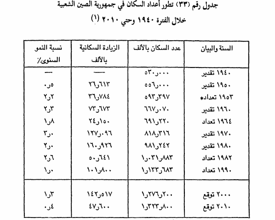 أما نمو سكان الصين منذ منتصف القرن العشرين، وتوقعات هذا النمو حتى نهاية العقد الأول من القرن القادم فتظهر في الجدول رقم (33) والذي يتضح منه ما يلي: -