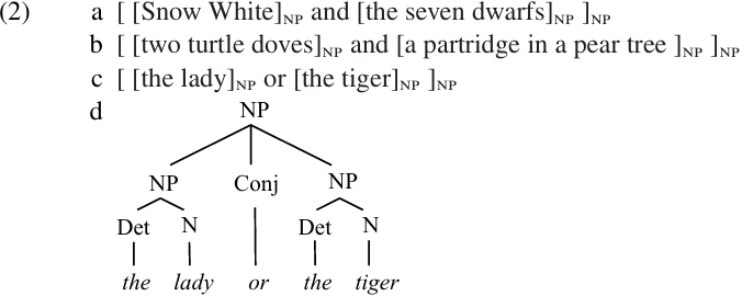 There are two basic ways in which one clause can be embedded within another: COORDINATION vs. SUBORDINATION. In a COORDINATE structure, two constituents belonging to the same category are con joined to form another constituent of that category. Such a structure is usually considered to be doubly headed, since both of the conjoined elements function as heads of the larger unit. Some simple examples of coordinate NPs are shown in (2):
