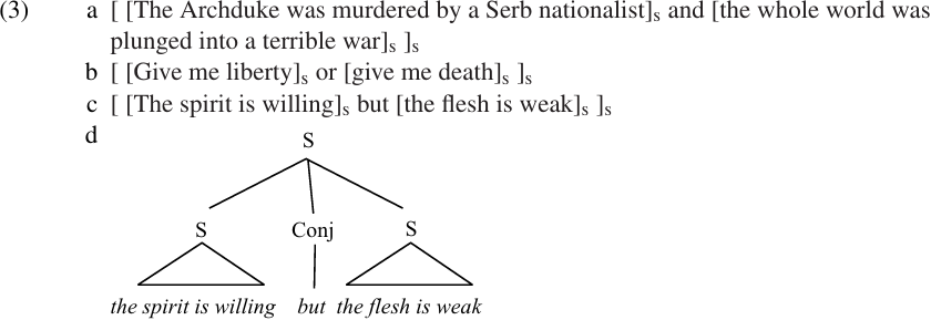 In a coordinate sentence, two (or more) S constituents occur as daughters and co-heads of a higher S. Each of the daughter clauses has the internal structure of an independent sentence, and neither is embedded in the other. Coordinate sentences in English are normally linked by conjunctions such as and, but, and or, as in the examples in (3). In other languages, coordinate sentences may be formed by simply juxtaposing two independent clauses, with only the second receiving final intonation.