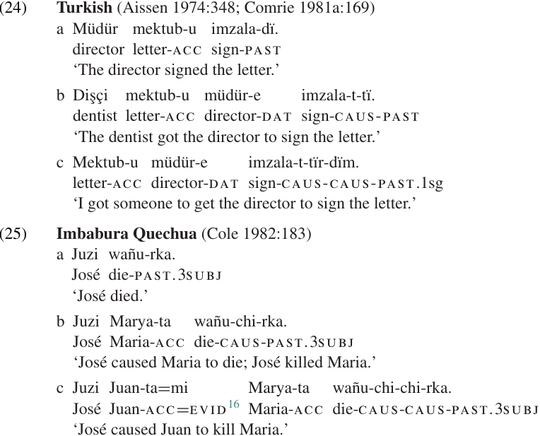 Second, derivational affixes can sometimes occur more than once within the same word. This is at least marginally possible in English, as in re-reinstate, re-reinvent, etc. (School principal to teacher: If you expel my nephew again, I will simply re-reinstate him.) Clearer examples are found in other languages. Manipuri has another modality marker, -lə ∼-rə, which indicates likelihood or probability. This suffix can be doubled or even tripled to indicate certainty: saw-rə-ni ‘is probably going to be angry’; saw-rə-rə-rə-ni ‘is definitely going to be angry.’ Double causatives are reported in a number of languages, including Turkish (24c) and Quechua (25c).