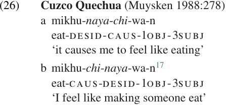 Third, the ordering of derivational affixes may be variable, with different semantic interpretations indicated by the differences in affix order. The causative and desiderative suffixes in Cuzco Quechua can appear in either order, as illustrated in (26).