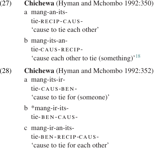 In Chichewa (Bantu, East Africa), the causative and reciprocal suffixes may appear in either order, as in (27). If the causative suffix appears next to the benefactive suffix, the causative must come first as in(28a). However, the benefactive suffix may precede the causative provided that some other affix intervenes, as in (28c). (Note that these examples involve only stems; all inflectional affixation, including subject agreement and tense, are omitted.)