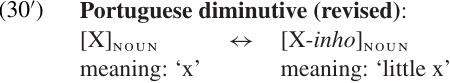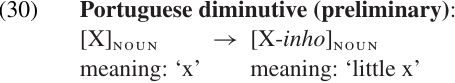 (a)the phonological effects on the base form (e.g. the shape of the derivational affix and where it is attached); (b) the semantic changes associated with this process; and (c) the syntactic category of the base (input) and of the resulting stem (output). To take a specific example, let us begin with the Portuguese diminutive suffix-inho. The WFR for this suffix might look something like (30).