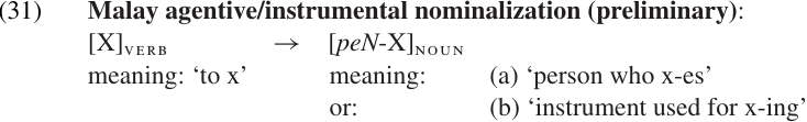 The “X” in this rule stands for the phonological shape of the base. The rule says that the suffix–inho can be added to a noun stem meaning ‘x’ to create another noun which means ‘littl ex.’ To take another example, let us consider the Malay prefix illustrated in (16–17), which derives nouns from verbs: