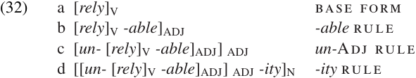 rely although there is no single WFR which could express the relationship between the root and the derived form. It would take a sequence of several WFRs, applying in the correct order, to connect the two, as illustrated in (32).20 The use of labeled brackets, as in (32d), is a common way to represent the internal structure of a stem.