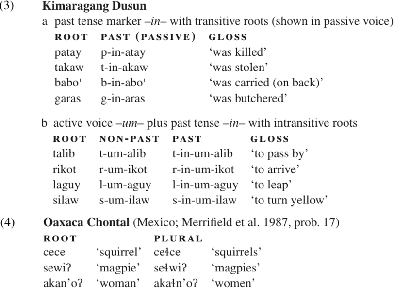 As mentioned above, an INFIX is an affix that is added inside another morpheme. Two well-known examples are found in Tagalog: the realis marker-in-, mentioned above; and the Active Voice marker-um-. Cognate forms occur in Kimaragang Dusun, with slightly different functions. (3a) shows the use of the past tense marker–in– with transitive roots in the passive voice, while (3b) shows the use of both infixes within transitive roots. Another example is the plural marker on Oaxaca Chontal nouns (4).