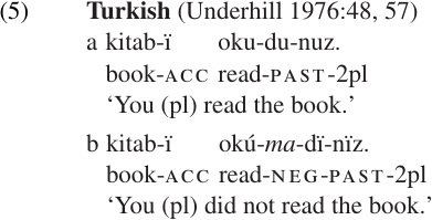 It is also important to remember that the term “infix” cannot be applied to every affix that occurs in the middle of a word. It refers specifically to an affix which is inserted inside another morpheme. Many languages allow long strings of affixes, but as long as they occur one after another, rather than one inside another, none of them would be called infixes. For example, consider the negative marker in (5b). If we compare the negative verb in (5b) with the corresponding positive form in (5a), we could say that the negative affix gets inserted in the middle of the word. However, it does not occur inside another morpheme, but between the root and its suffixes; so, it is not an infix, but just another suffix.