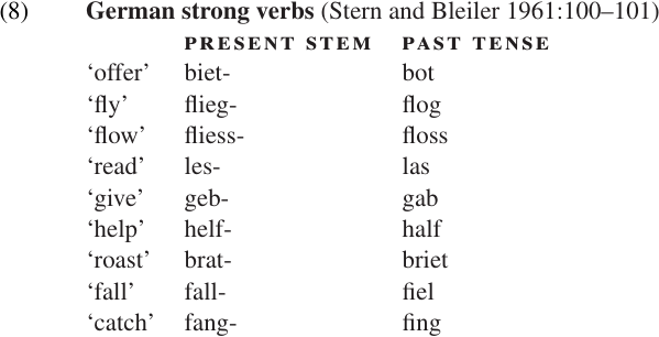 MUTATION refers to a change in the quality of one or more phonemes in the base form. Vowel mutation is relatively common, and is often referred to by the more specific term ABLAUT. German provides many examples, both in nominal forms (singular vs. plural, similar to the English goose/geese) and in the paradigms of the “strong” verbs. A few of the many patterns of ablaut in verb stems are shown in (8). Of course, similar examples are found in English as well: sing/sang, drink/drank, swim/swam, run/ran, eat/ate, etc. These examples are interesting because the change in vowel quality itself is the marker for past tense; at least superficially, there appears to be no past tense affix involved.