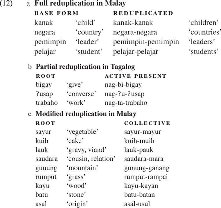 REDUPLICATION involves the repetition of all or part of the base form. Reduplication is extremely wide spread, and occurs in many different forms. A few representative examples are given in (12). Some of the critical issues which must be clarified in the analysis of reduplication include the following.