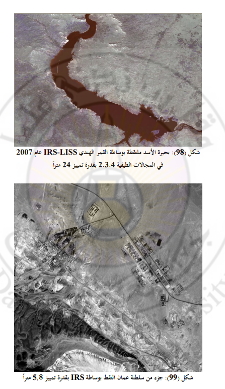 أما القمر IRS-1C فقد حلق في الفضاء عام 1995م وأطلق توأمه القمر IRS-1D عام 1997م. وقد حمل القمران التوأمان جهازاً محسناً هو LISS-III بقدرة تمييز تصل إلى 5,8 م في المجال البنكروماتي ضمن مجال طيفي وحيد طوله 0,750,5 میكرومتر يكمل دورته في 24 يوماً. أما قدرة التمييز الأرضي في المجال المرئي وتحت الأحمر القريب فتبلغ 23,5م، وعرض الشريط المصور 141 كم ، كما يحتويان على مشعر حقلي عريض WiFS Wide Field Sensor بقدرة تمييز 180م ويتم دورته كل 24 يوماً أيضاً يوجد في القمر IRS-P3 الذي أُطلق عام 1996م قناة إضافية طول موجتها يتراوح بين 1-1,7 ميكرومتر انظر الجدول (14) والشكلين (98 و 99). انتهى العمل بالقمر IRS-1A عام 1996م والقمر IRS-2B عام 2003. وعام 2006م انتهى العمل بالقمر IRS-P32، تلاه القمر 1-IRS عام 2007م أما القمر IRS-1D فقد استمر بالعمل حتى عام 2010م.