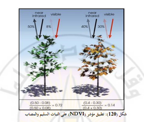 هذا ويمكن من خلال تطبيق هذه المعادلة تحديد النباتات السليمة والمريضة ، حيث إنّ الغطاء النباتي السليم إلى اليسار يمتص معظم الضوء المرئي الذي يصطدم به ويعكس جزءاً كبيراً من ضوء الأشعة تحت الحمراء القريبة. أما النباتات غير السليمة أو المريضة (إلى اليمين) فإنها تعكس بشكل أكبر ضوء الأشعة المرئية وبشكل أقل ضوء الأشعة تحت الحمراء القريبة وتمثل الأرقام على الشكل القيم الفعلية، ولكن الغطاء النباتي الحقيقي يكون أكثر تنوعاً بكثير.
