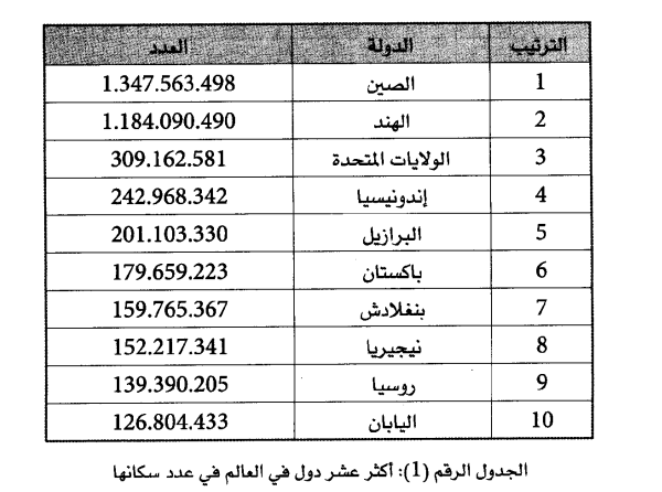 (الصين 21.1 %) (الهند 13.6 %) (باكستان 4.8 %) (نيجيريا 3.9 %)، (بنغلاديش 3.7 %) (وإندونيسيا 3,9 %) ويختلف توزيع السكان من دولة إلى أخرى بل من منطقة إلى أخرى داخل الدولة الواحدة، فنجد مناطق ذات كثافة سكانية عالية حيث يتركز 50 في المائة من السكان في مساحة لا تتجاوز 5 في المائة من الدولة والـ 50 في المائة الأخرى من السكان في الـ 95 في المائة من المساحة الباقية وتمثل الدول المتقدمة (الصناعية) أقل نسبة بين الدول في الأعداد البشرية وفي الزيادة السكانية، فأعداد السكان فيها حوالي 1,2 مليار نسمة وستزيد هذه الأعداد بنسبة ضئيلة خلال الخمسين عاما المقبلة بينما أعداد البشر كانت في الدول النامية فقط في العام 2000 حوالي 4.9 مليار نسمة، وسوف تزداد أعداد سكان العالم في العام 2050 لتصبح حوالي 8.1 مليار نسمة، وترجع هذه الزيادة الهائلة إلى قلة الوعي الاجتماعي وقلة الدخل وزيادة الخصوبة في الدول الفقيرة عنها في الدول المتقدمة. فالمرأة في الدول النامية الفقيرة تسجل مواليد بنسبة 3,1 طفل لكل امرأة بينما في الدول المتقدمة فإن معدل المواليد لكل امرأة هو 1.57 فقط وذلك ما تم تسجيله خلال الفترة من العام 1995 وحتى العام 2000، وبالطبع فإن المستوى المعيشي المرتفع وكذلك زيادة مستوى الدخل يساعدان على تنشئة الأطفال في جو صحي سليم وبيئة اجتماعية متقدمة بعكس أطفال الدول الفقيرة الذين يعانون من الفقر والجوع والمرض.