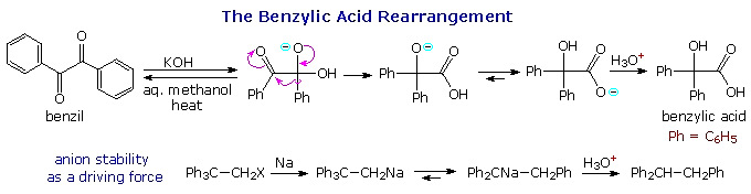 Two examples of 1,2-phenyl shifts are shown in the following diagram. In each case the driving force for the rearrangement is the conversion of a less stable anion into a more stable one. The reversible addition of hydroxide ion to one of the benzil carbonyl groups produces an intermediate which undergoes a pinacol-like rearrangement. In contrast to the carbocation "pull" that initiates the pinacol rearrangement, this benzylic acid rearrangement complements a weak electrophilic pull by the adjacent carbonyl carbon with the "push" of the alkoxide anion. A rapid proton transfer then forms the relatively stable carboxylate anion. In the second example, a very reactive 1º-carbanion (pKa ≈ 45) is converted to a diphenyl resonance stabilized carbanion (pKa ≈ 34).