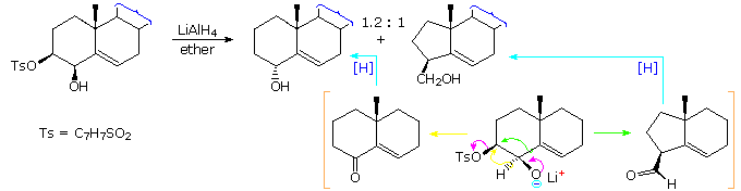 Similar 1,2-shifts of hydrogen or alkyl groups may also be favored by loss of a stable anion, as illustrated by the following example. Once again, an alkoxide anion provides a "push", and loss of the stable tosylate leaving group terminates the rearrangement. The LiAlH4 reagent not only generates the oxy-anion, but also reduces the resulting carbonyl products to alcohols. This rearrangement contrasts with the Wagner-Meerwein rearrangement in which a stable anion leaving group initiates the process by generating a carbocation species.