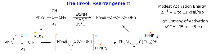 The rearrangement of silicon groups from carbon to oxygen is called the Brook rearrangement. An important driving force for this shift is the increased bond strength of the Si–O bond (110 Kcal/mol) compared with the Si–C bond (76 Kcal/mol). The example given in the following equation is catalyzed by base, and a cyclic transition state is indicated by the high entropy of activation. Retention of configuration at the silicon atom during the rearrangement was demonstrated by the reaction sequence shown by clicking on the diagram. Since the benzylation of the silyl chloride is known to proceed with inversion, and the final hydride reduction with retention, the rearrangement itself must have occurred with retention. Note that the sign of optical rotation for different silyl derivatives does not necessarily correlate with their configuration.