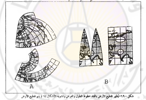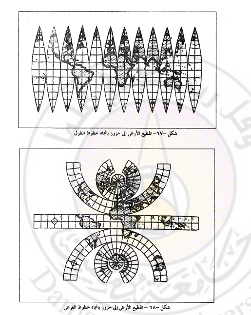 إن تقسيم الأرض إلى شرائح قد يلغي التشويه لأن المساحات والأبعاد تكون مساوية لما هي عليه على الأرض، لكن ما ينتج عن التقسيم أسوأ من التشويه وهو إلغاء وحدة الكرة الأرضية. 200 استخدام مساقط الرسم بمساعدة سطوح الإسقاط فيتم تمثيل السطح الكروي على سطح مستو، ويمكن نقل جزء من سطح الأرض كاملاً إلى أحد سطوح الإسقاط المختلفة. نظام الإسقاط واستخدام المساقط ليس جديدا فقد فكر فيه العلماء بعد اكتشاف كروية الأرض من قبل ماجلان انظر 1995 Robinson فقد وضع مركاتور 1569 اللبنة الأساسية لتحويل سطح الأرض إلى سطح مستو بشكل رياضي مستخدماً نظام الإسقاط في وضع خريطة للعالم. بعد ذلك تعددت طــرق تحويل السطح الكروي إلى سطح مستو بشكل رياضي.