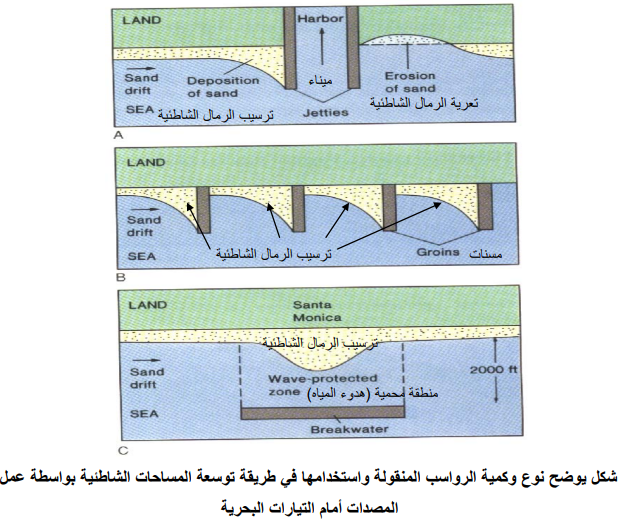 العوامل التي تؤثر على طبيعة الرواسب البحرية المتراكمة هي قرب أو بعد منطقة المصدر الصخري للرواسب، وعمق المسطح المائي، ونوع وكمية الرواسب المحمولة مع الأنهار ودرجة حرارة الماء، ودرجة ملوحة الماء، ودرجة صفاء الماء ويمكن للإنسان أن يغير من طبيعة الشواطئ بواسطة وضع الحواجز الصناعية أمام التيارات المحاذية للشواطئ الشكل المرفق يوضح كيفية زيادة مساحة الرقعة الساحلية بوضع حائط طويل عمودي على الشاطئ أو موازي للشاطئ مما يؤدي إلى اصطدام الأمواج المحاذية للشاطئ بهذه الحواجز ثم ترسيب حمولتها من رواسب مع مرور الوقت لكن يجب الأخذ بعين الاعتبار دراسة البيئة الساحلية بدقة لأن هذه العملية تؤدي إلى خلق مناطق تعرية أيضا خلف الحواجز ثم تشويه السواحل أو دمار المنشآت المختلفة.