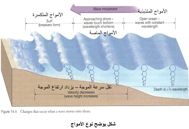 2ـ الأمواج الماصة (Wave Of Translation) عند وصول الأمواج إلى الشاطئ ومقابلتها للأمواج المتحركة بعيدا عن الشاطئ يحصل تقليل في طول الموجة تقليل السرعة وطول الموجة يصاحبه استطالة إلى الأعلى زيادة ارتفاع الموجة حتى تصل إلى ارتفاع معين الذي يعرف بنقطة الارتفاع الحرجة وميل حركة جزيئات الماء باتجاه الشاطئ.