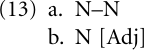 Instead, of central interest here is a process to be observed in quite a number of languages where two nouns are juxtaposed—with the effect that one of them is grammaticalized to an adjectival modifier while the other is the head of the construction—accordingly, a structure such as (13a) is grammaticalized to a recursive structure (13b) (see “The first layer: nouns”).
