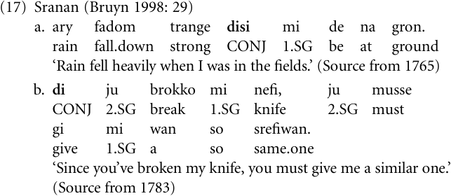 As we observed in “The demonstrative channel”, the most frequent development in the languages of the world is to create a new relative clause structure via the grammaticalization of demonstrative pronouns (not attributes), and creoles have also made use of this mechanism, as we will now demonstrate with an example from the English-based creole Sranan of Suriname.1 Sranan arose in the late seventeenth century on the plantations of Suriname, which was made a British Colony in 1651; in 1668, Dutch became the colonial language. As in pidgins and newly emerged creoles, there were essentially no formally marked relative clauses in early Sranan: The English relativizers were lost, and most of the text examples that were seemingly unmarked relative clauses might also receive alternative interpretations, and there is no evidence that there was a recursive structure of relativization. Zero marking of relative clauses continued throughout the nineteenth and twentieth centuries.