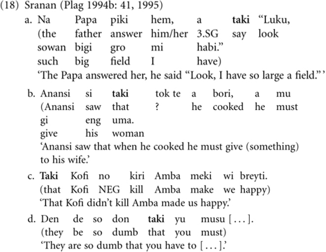 The initial stage of this development in Sranan falls into a period probably dating from 1780 to 1850. In (18a), taki is suggestive of a quotative marker (stage 1), although it can still be understood in its literal sense (stage 0). Sentence (18b) shows the use of taki as an object complementizer (stage 2), while (18c) is an example of the subsequent stage of a marker of subject complement clauses (stage 4). Finally, in (18d), taki has acquired the function of an adverbial clause subordinator.