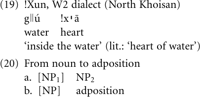 One kind of decline is provided by the development of adpositions. Cross linguistically the most common pathway in which adpositions arise is via the reinterpretation of nouns for body parts or environmental landmarks, forming the head of possessive constructions, as prepositions or postpositions (Heine, Claudi, and Hünnemeyer 1991; Heine 1997b). For example, the phrase (19) is historically a possessive construction consisting of the modifier noun gǀǀu̒ ‘water’ and the head noun !xˡ ā ‘heart’, but the latter has been grammaticalized to a postposition meaning ‘inside’. The earlier syntactic structure of (19) can thus be represented as in (20a) while its present structure takes the form (20b). Note that this is by no means an uncommon example; similar examples can be found in other languages across the world.